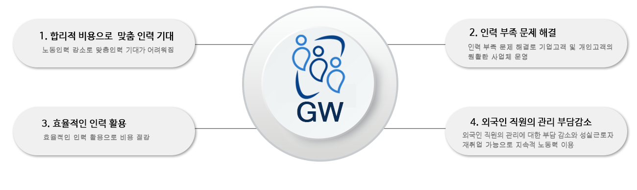 외식 프랜차이즈/ 구내식당(휴게소식당) / 호텔,콘도에 외국인 인력을 고용하여 서로 WIN-WIN하는 서비스.