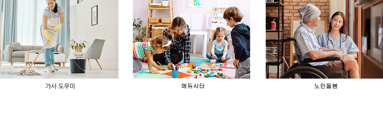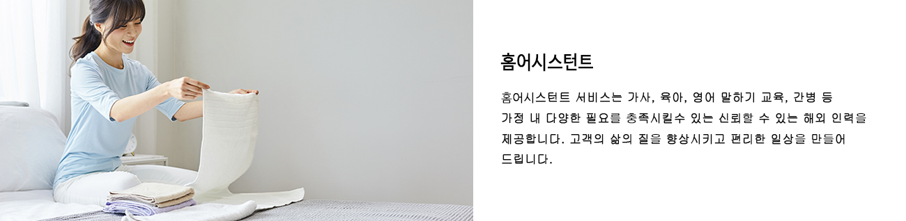 가사도우미/ 에듀시터 / 노인돌봄 등 가정내 필요한 외국인 인력을 고용하여 일상의 편리함을 주는 서비스.
